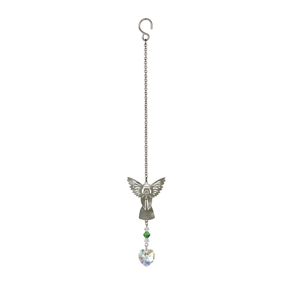 A beautiful angel ornament, accented by a peridot green birthstone crystal, leads to an aurora borealis heart. The August Birthstone Angel Suncatcher makes a great, personal gift, specially chosen with the recipient in mind. Genuine Austrian crystals sparkle and shine in the sun and gift is recommended for indoor use. Measures 3″ long, overall length 8.5″ with hanging chain and hook.