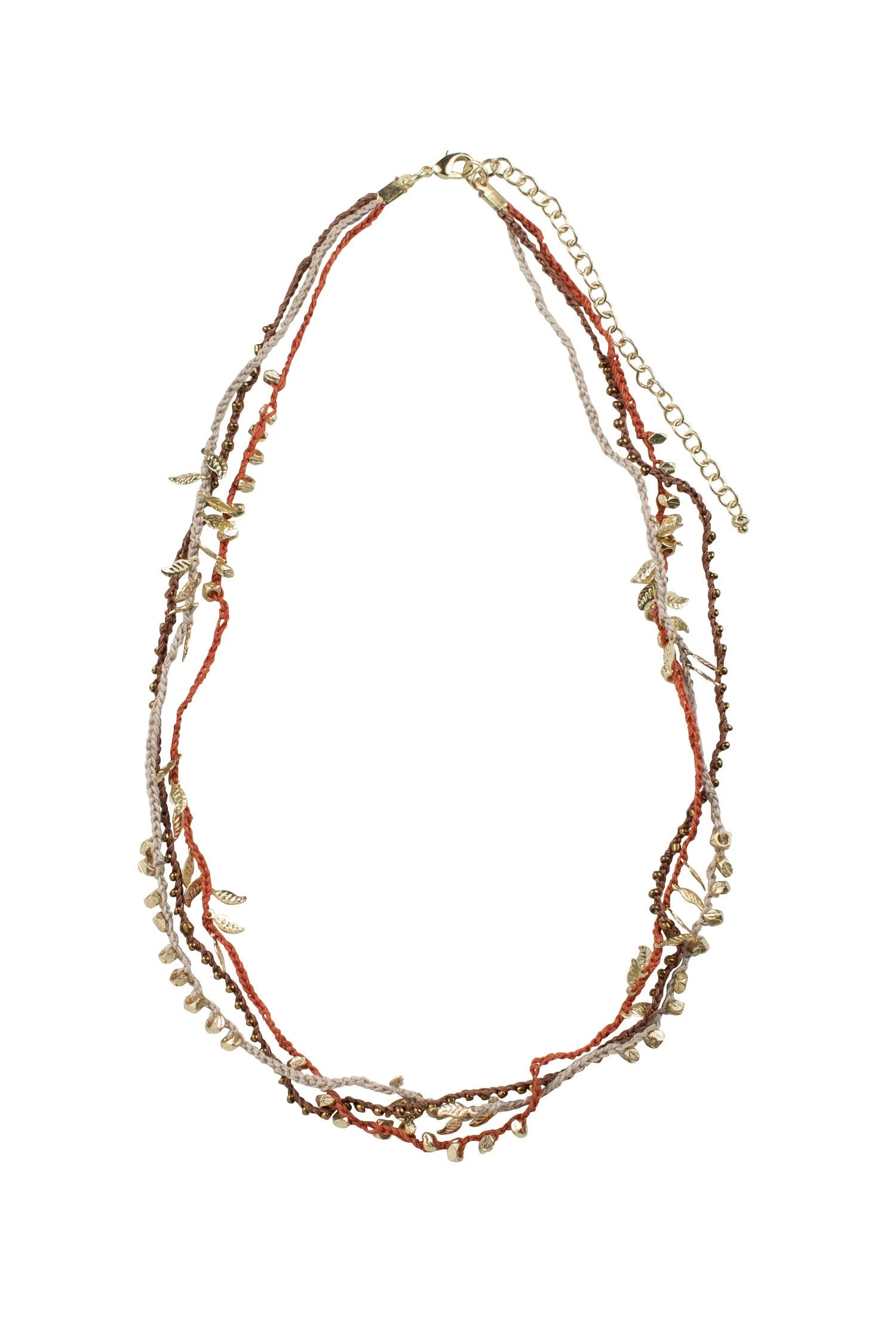 - Multistrand crocheted cotton necklace with glass beads and brass beads finished in mixed metal tones