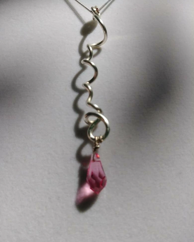 This is a Freeform Silver Wire pendant with a Pink faceted teardrop Swarovski Crystal suspend from the bottom by Sterling Silver wire. It is supported by a dainty Sterling Silver chain with round Sterling Silver clasp.Â