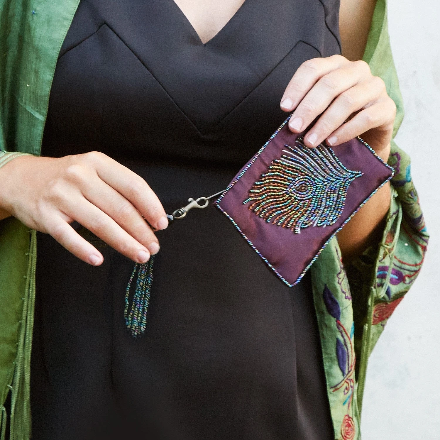 This purple satin coin purse will make ordinary pocket change feel like gold doubloons. Embellished by hand with a beaded peacock feather, this coin purse will transform any ordinary day into a whimsical one. A beautiful Global Fair Trade gift.