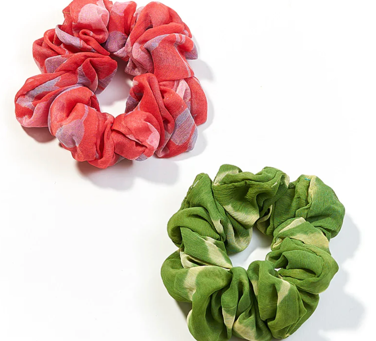 Set of two unique, handcrafted scrunchies in vibrant assorted colors and patterns.