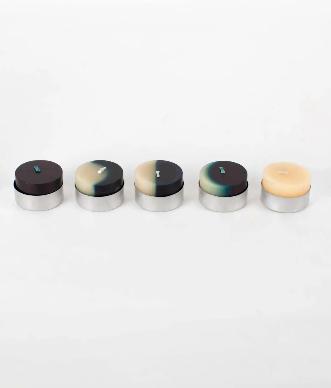 - Box: 9.5L x 2.25W x 1.5H inches; Each tealight candle: approximately 1.5D x 1H inches; Box is held closed by a silver‒colored ribbon measuring approximately 24L inches